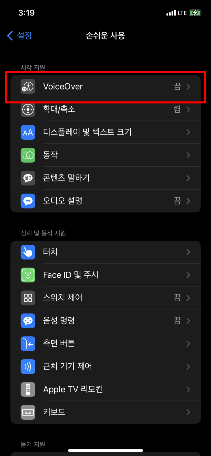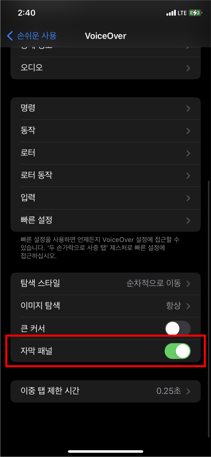 iOS 13에서는 VoiceOver의 음성정보를 시각적으로 볼 수 있는 '자막 패널' 이 추가되었다.